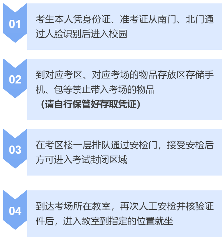 3. 考試結束后,考生要按監考員的指令有序離場,存包的同學須有序前往物品存放區有序排隊取回自己物品。