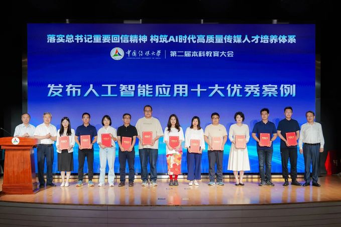 副校長王暉發(fā)布并介紹了學(xué)校人工智能應(yīng)用十大優(yōu)秀案例。他表示,學(xué)校在本學(xué)期精心為教職工打造人工智能素養(yǎng)訓(xùn)練營,開展基礎(chǔ)班、進(jìn)階班兩輪系統(tǒng)培訓(xùn),共舉辦18場專題講座,全校深度參與。在此次人工智能培訓(xùn)考核中,從“AI+教學(xué)”“AI+創(chuàng)作”“AI+科研”“AI+管理”四大賽道367項(xiàng)高質(zhì)量原創(chuàng)案例中評選出十大優(yōu)秀案例。他強(qiáng)調(diào),這些案例凝聚著老師們的智慧與創(chuàng)新,更是學(xué)校推進(jìn)智能教育改革的生動(dòng)實(shí)踐,希望全體教師以獲獎(jiǎng)?wù)邽榘駱樱掷m(xù)深耕“人工智能+傳媒教育”實(shí)踐,勇立教育變革潮頭。