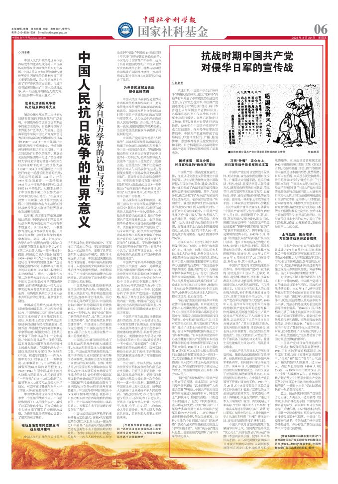 8月29日,《中國(guó)社會(huì)科學(xué)報(bào)》國(guó)家社科基金專版刊登項(xiàng)目成果文章《抗戰(zhàn)時(shí)期中國(guó)共產(chǎn)黨對(duì)侵華日軍的宣傳戰(zhàn)》。文章剖析了通過中國(guó)共產(chǎn)黨團(tuán)結(jié)多數(shù)、孤立少數(shù)的“兩分法”理論的形成,梳理了巧用“外嘴”、攻心為上的對(duì)日宣傳戰(zhàn)實(shí)踐,通過日本館藏檔案總結(jié)了中國(guó)共產(chǎn)黨對(duì)日宣傳戰(zhàn)在侵華日軍中造成的效果:士氣低落,逃兵增多,充分彰顯了中國(guó)共產(chǎn)黨在抗戰(zhàn)中不可替代的歷史貢獻(xiàn)。