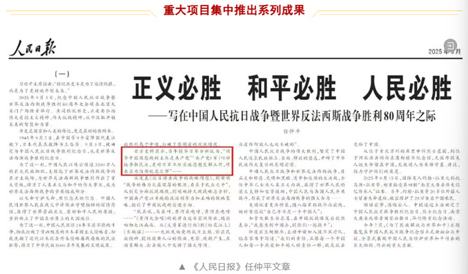 9月2日,《人民日?qǐng)?bào)》發(fā)表任仲平文章《正義必勝 和平必勝 人民必勝——寫在中國(guó)人民抗日戰(zhàn)爭(zhēng)暨世界反法西斯戰(zhàn)爭(zhēng)勝利80周年之際》,文章在第二部分引用了我校重大項(xiàng)目成果:日方史料顯示,當(dāng)年侵華日軍分析認(rèn)為,“領(lǐng)導(dǎo)中國(guó)思想戰(zhàn)的主體是共產(chǎn)黨”“共產(chǎn)黨(軍)巧妙地爭(zhēng)取民眾,更對(duì)日軍不斷實(shí)施思想瓦解工作,將來實(shí)為值得憂慮之事”······