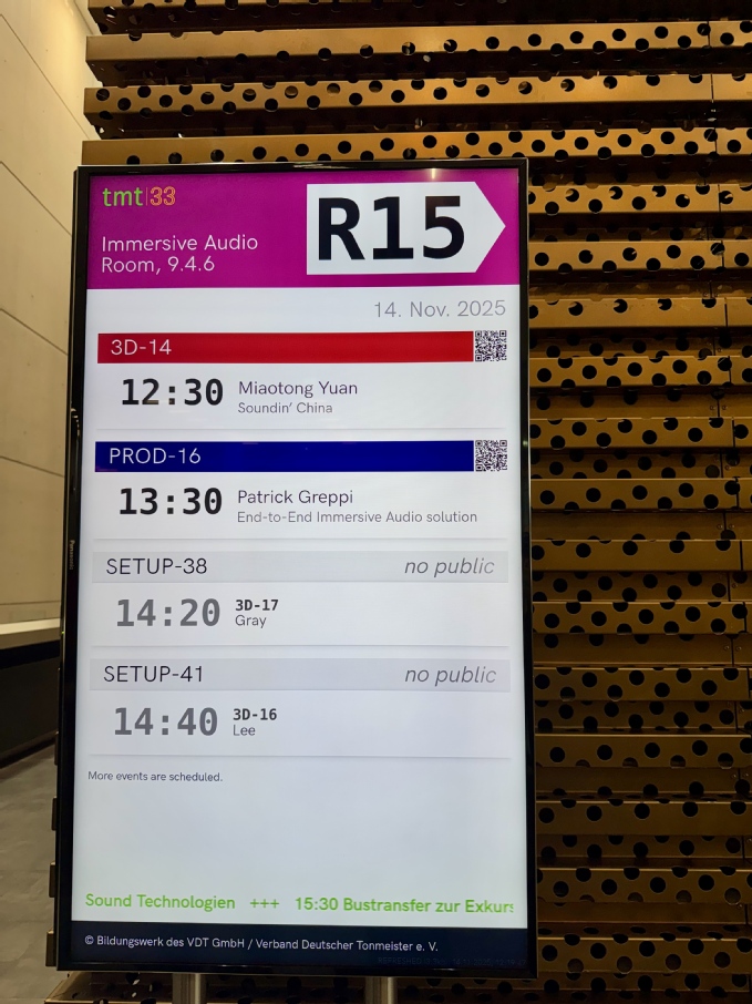 德國錄音師協會作為歐洲音頻行業的權威專業組織,其雙年會(Tonmeistertagung)自1949年首屆大會以來,始終引領全球專業音頻行業的創新發展。該雙年大會是我校和歐洲兄弟院校持續關注的專業國際頂會,往屆中國師生投稿入選率極低,2023年,袁邈桐教授開辟了中國之音專場的分論壇平臺,為我國的師生打開了國際會議的大門。在第一屆中國之音專場中,本校青年教師劉韌、本科生吳旭誠、研究生周詩樺的作品得到了專場展示和討論;2025年的第二屆中國之音專場分論壇還吸引到了中央音樂學院、上海音樂學院、浙江音樂學院師生的積極投稿和參與。本屆會議匯聚了全球音頻領域的頂尖學者與從業者,中國傳媒大學師生團隊的表現尤為突出。在第二屆“中國之音”專場分論壇中,袁邈桐教授帶領音樂與錄音藝術學院學生梯隊展示了多項創新成果。